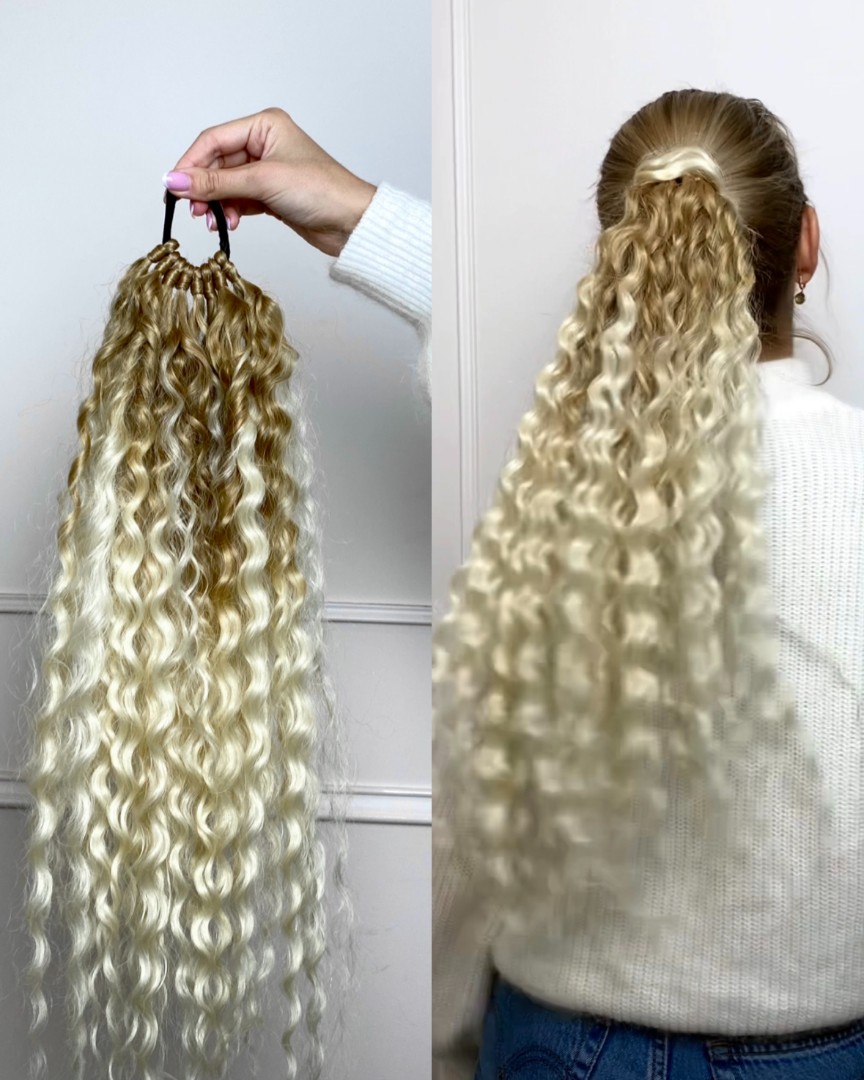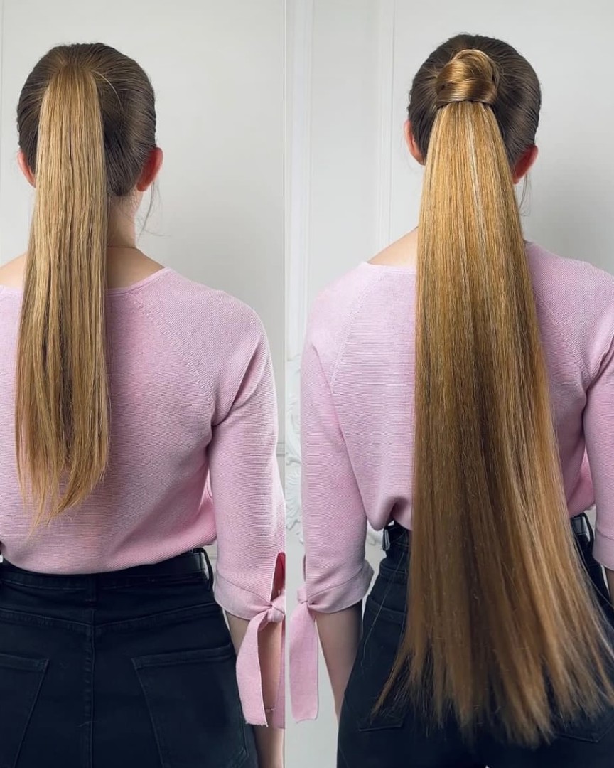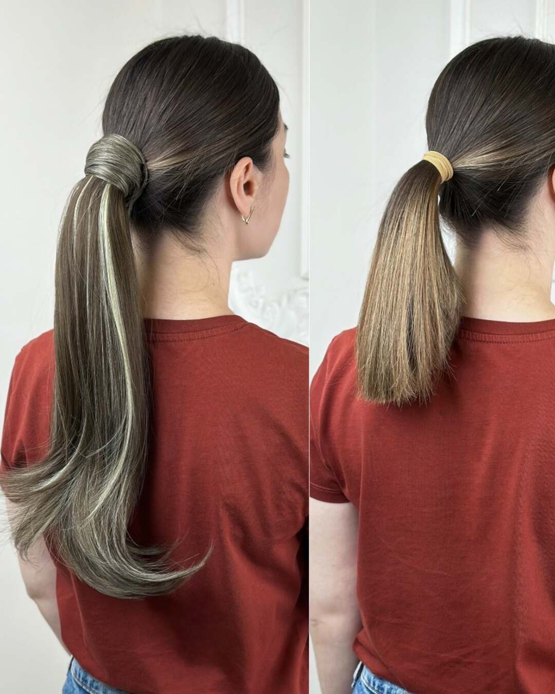 - Такие хвосты выглядят более естественно, потому что место фиксации шиньона к волосам практически незаметно.