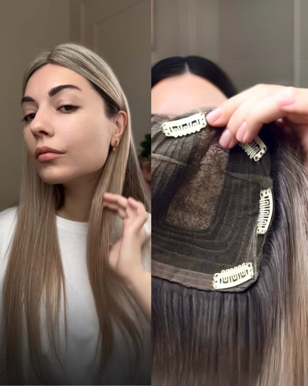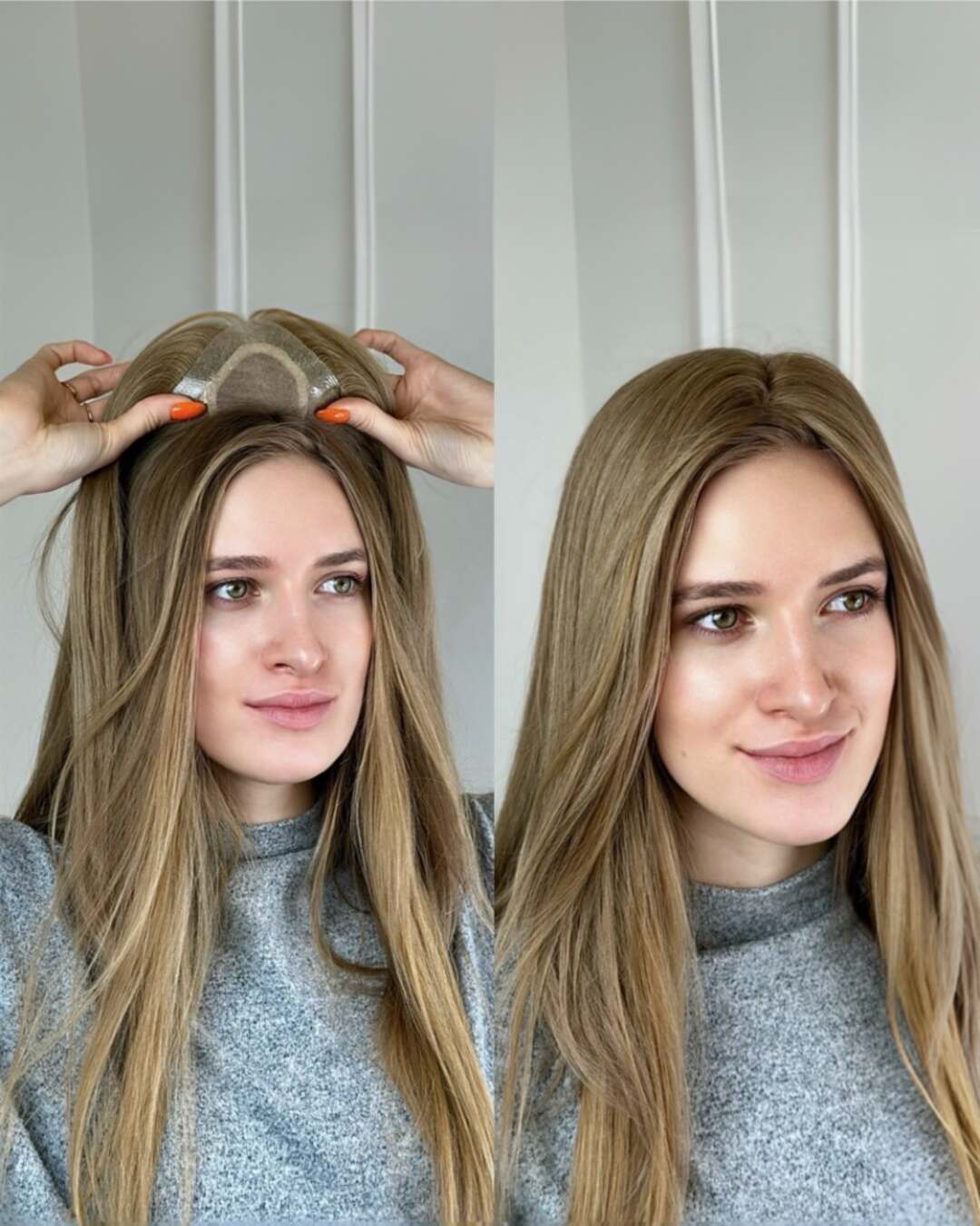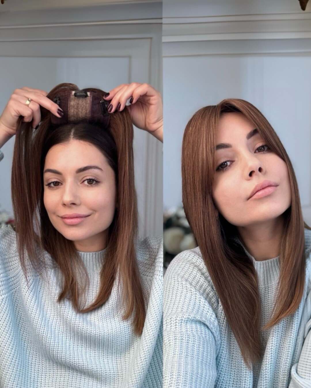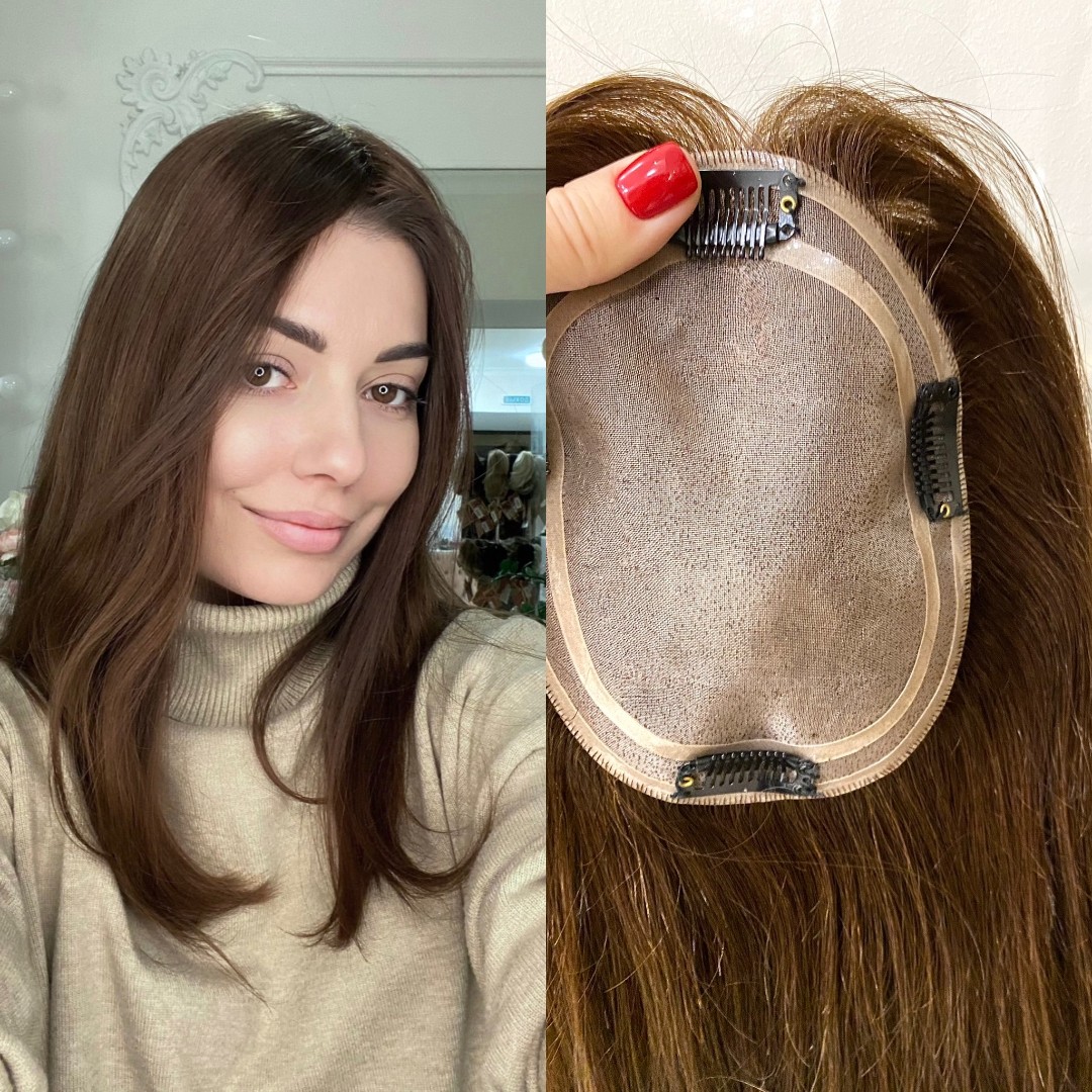 Натуральные накладки выглядят максимально естественно и полностью сливаются с вашей прической. Это универсальный вариант для тех, кто хочет, что бы изделие вело себя как собственные волосы.