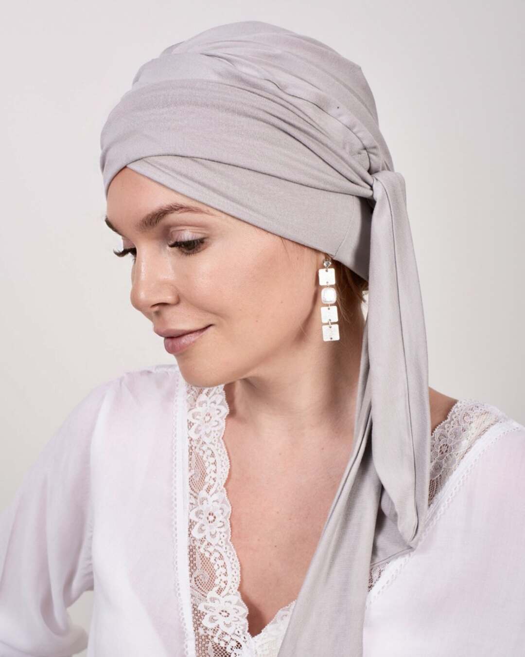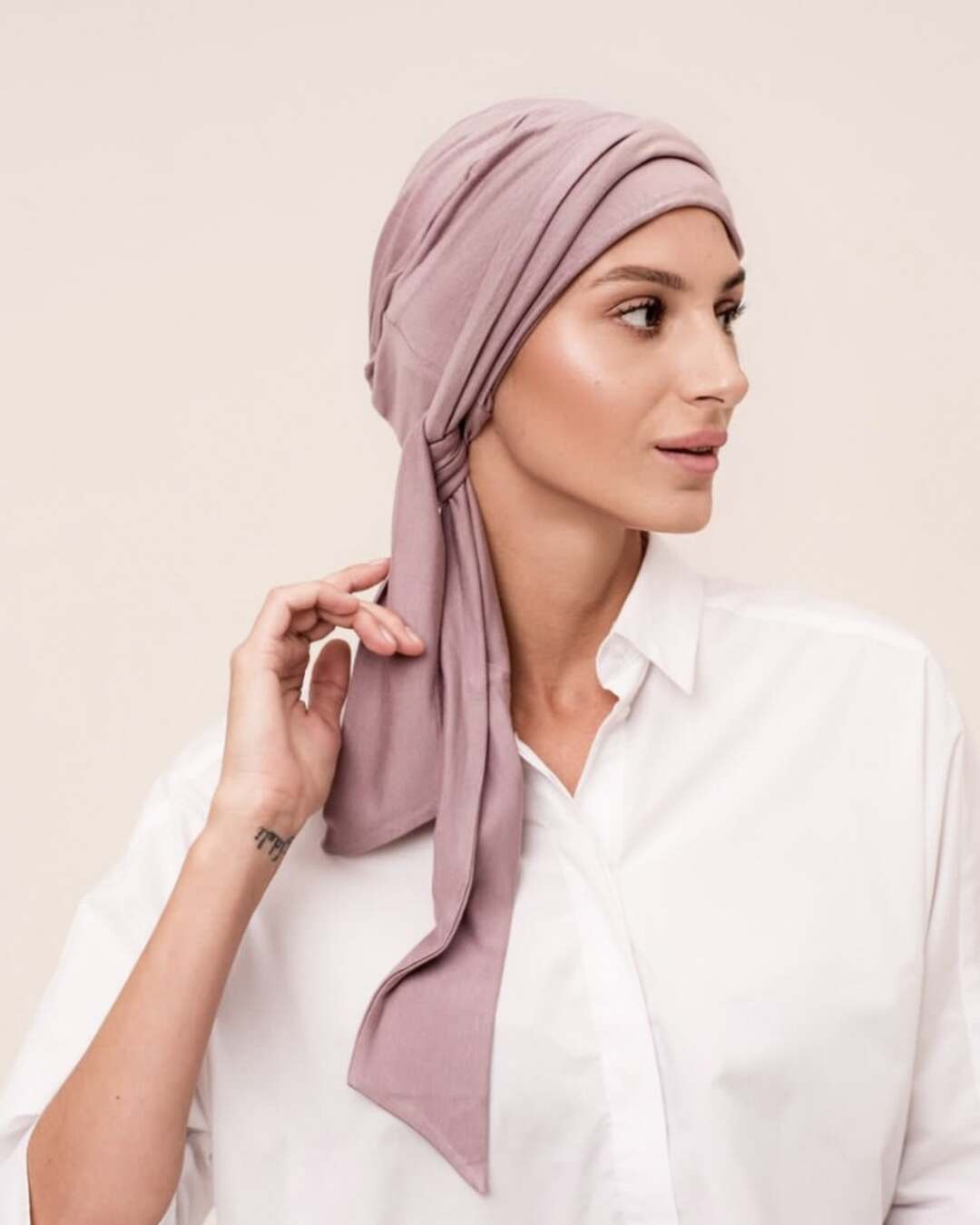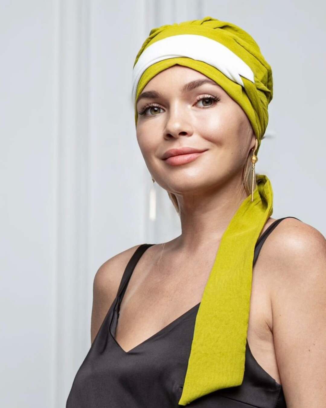 Тюрбан состоит из мягкой комфортной шапочки и двух лент, которые легко оборачиваются вокруг головы.