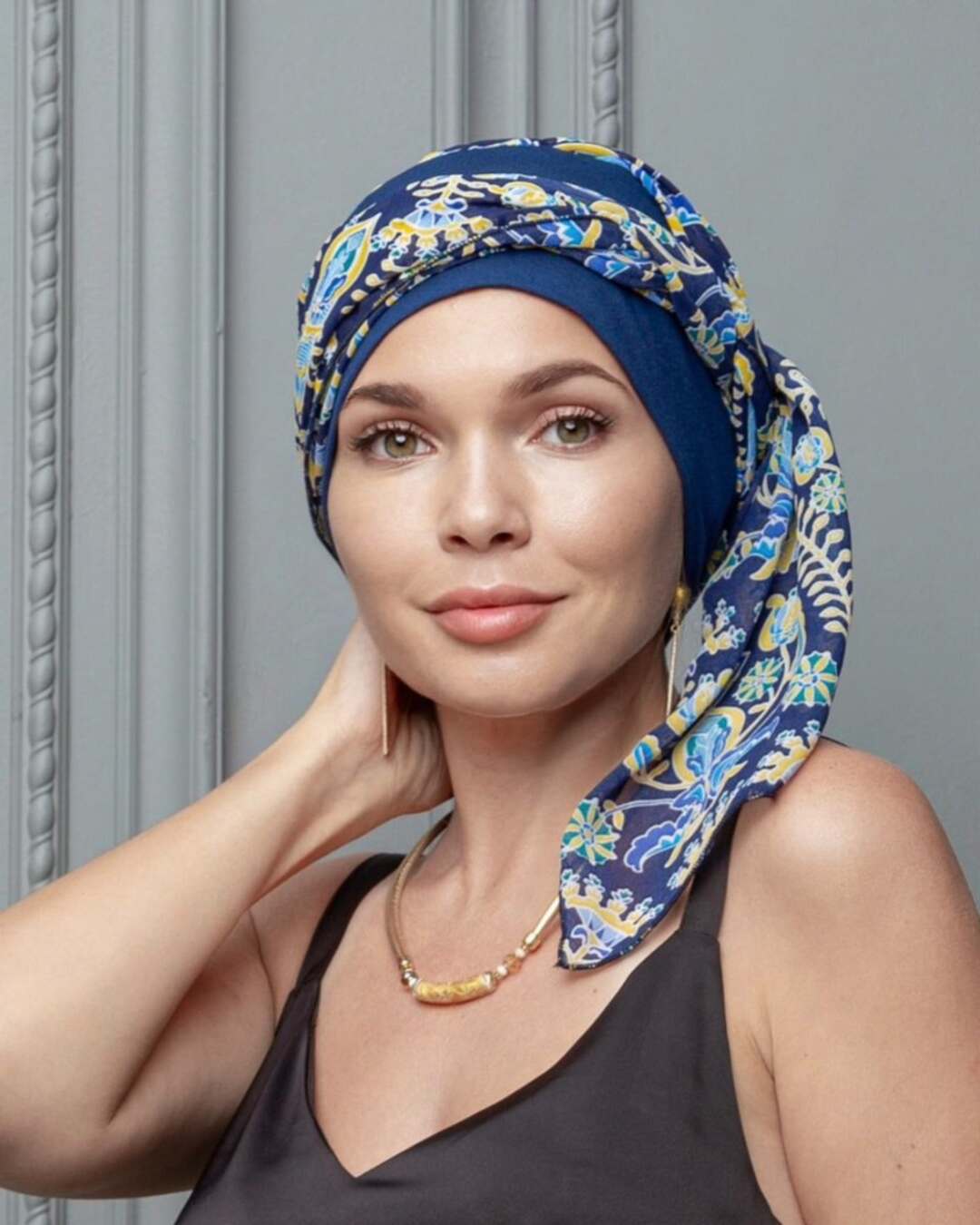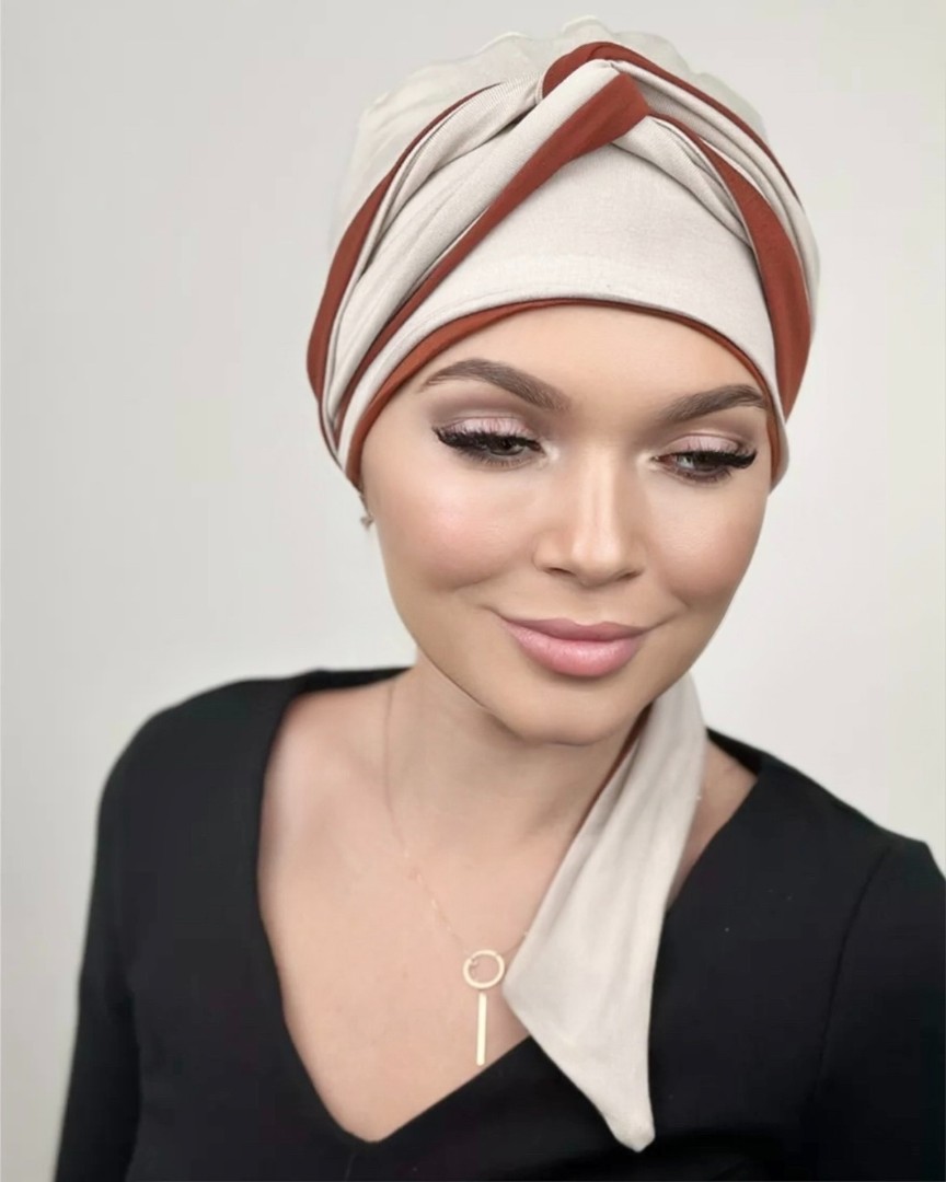 Тюрбан состоит из мягкой комфортной шапочки и двух лент, которые легко оборачиваются вокруг головы.
