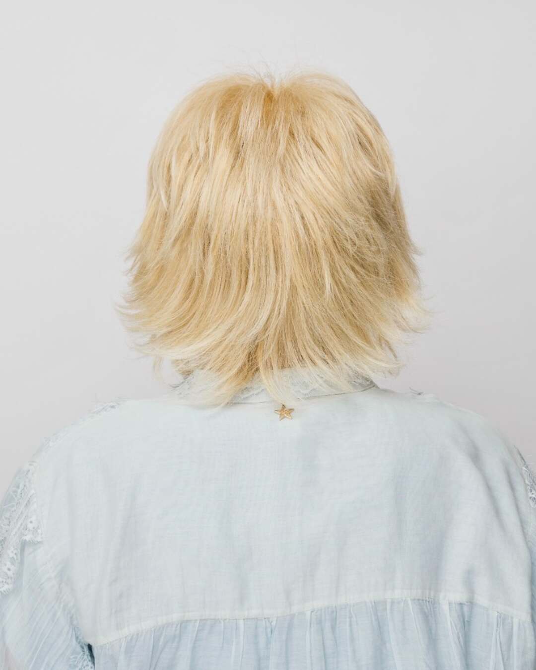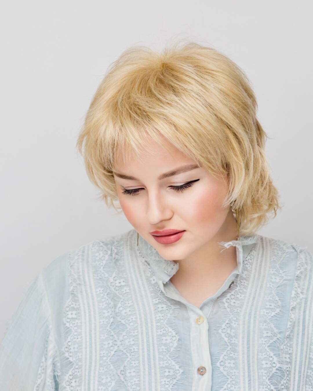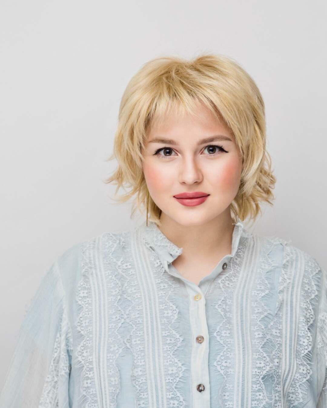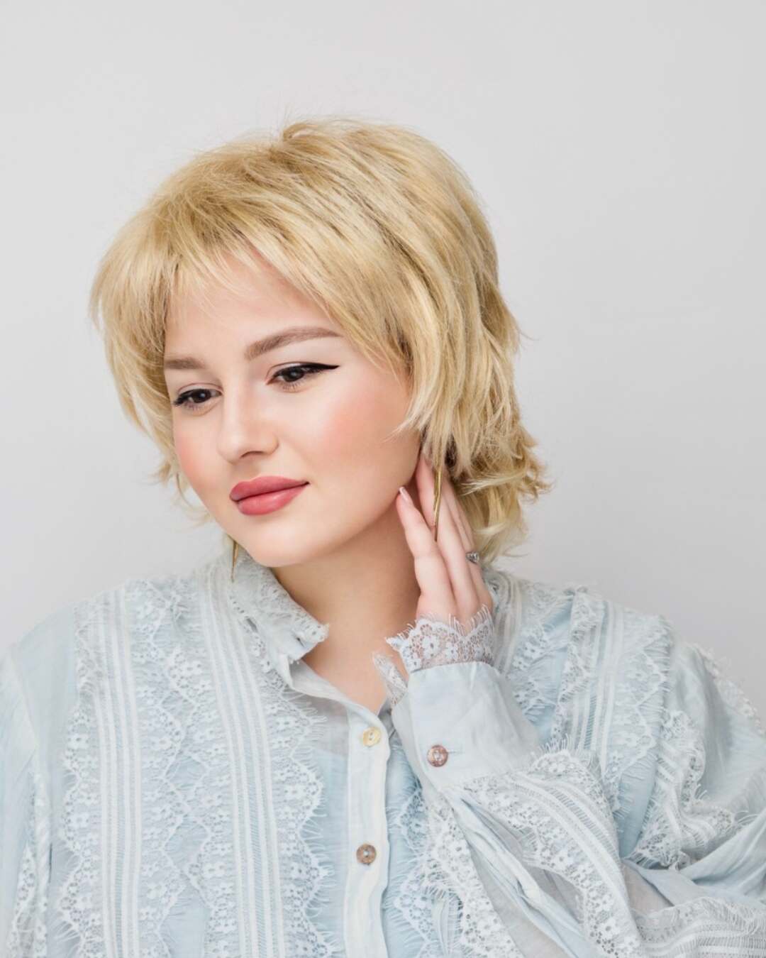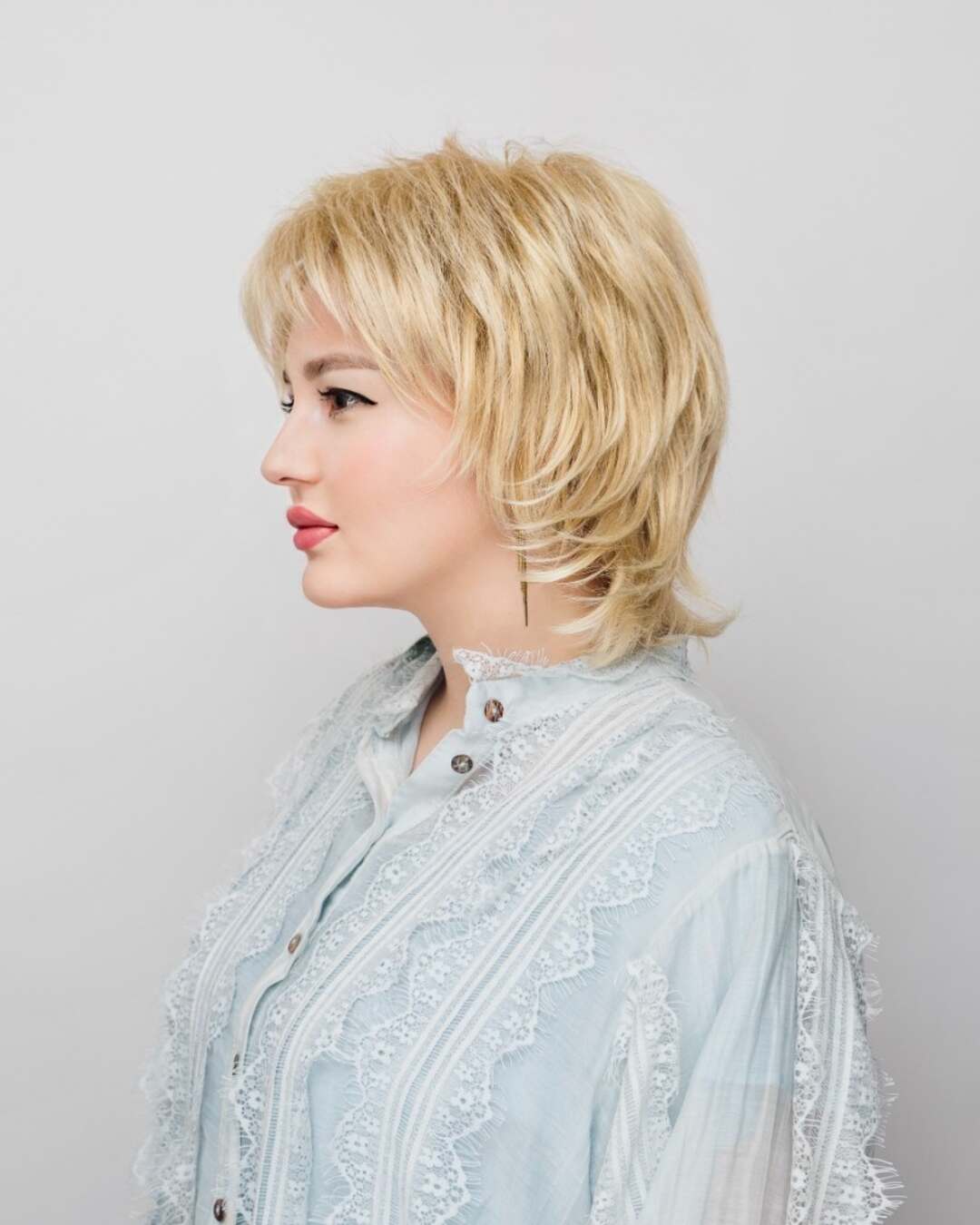 : без пробора, прикорневой начес, объем, каскад, концы прокручены наружу.