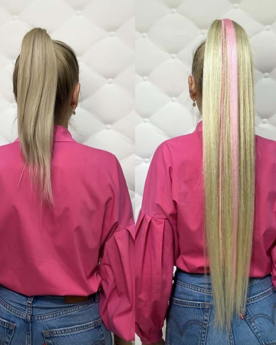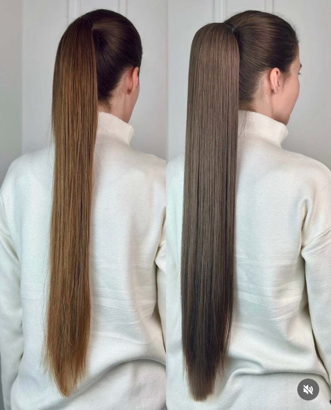 - Такие хвосты выглядят более естественно, потому что место фиксации шиньона к волосам практически незаметно.