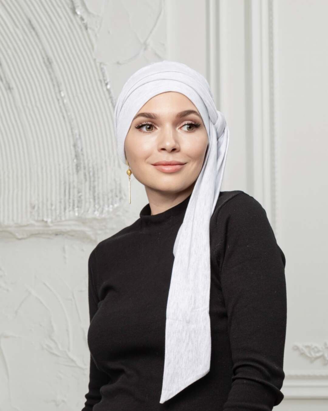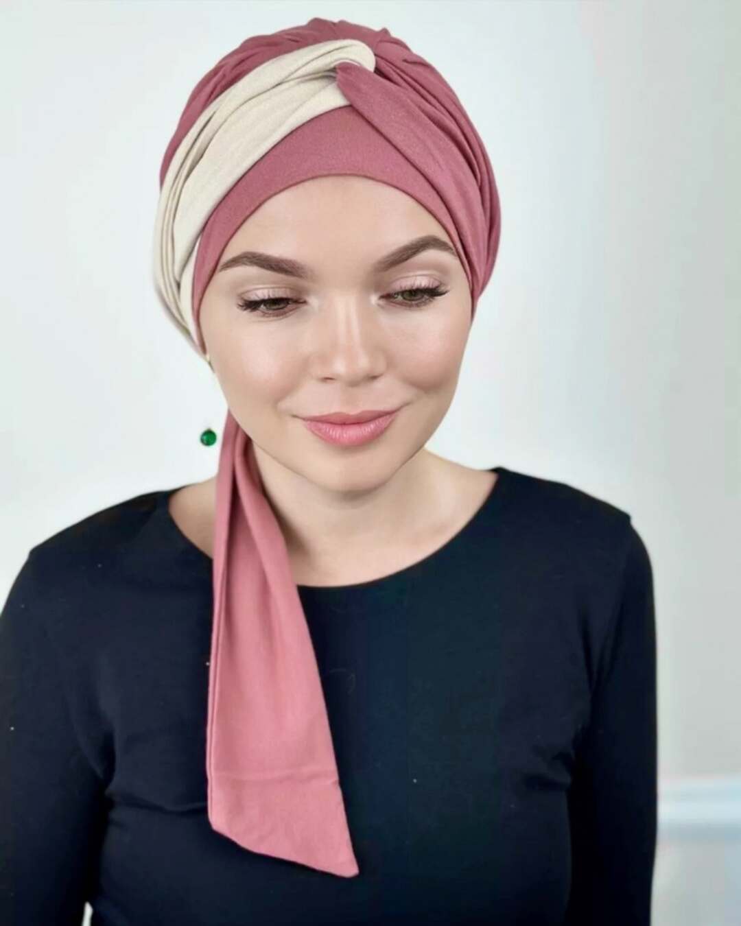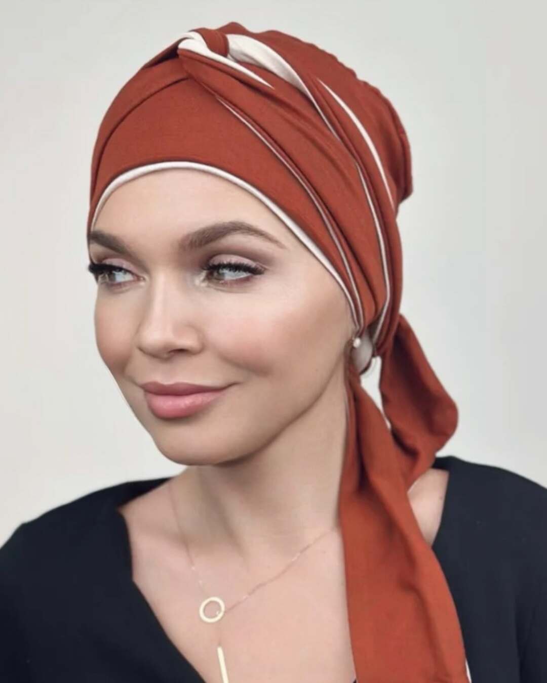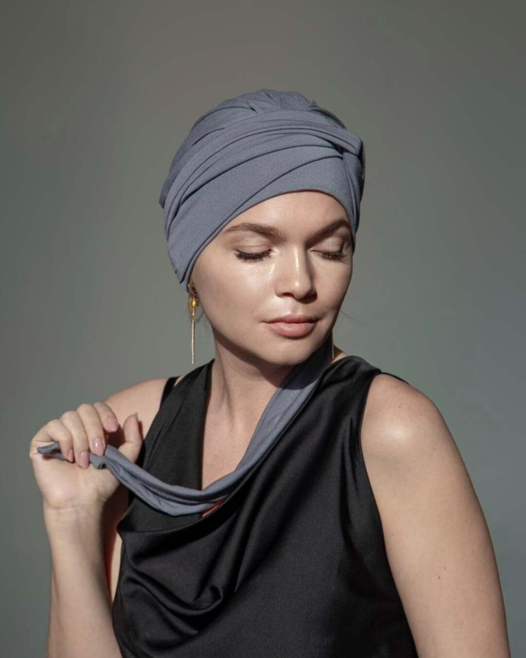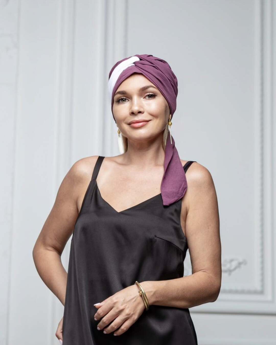 Тюрбан состоит из мягкой комфортной шапочки и двух лент, которые легко оборачиваются вокруг головы.