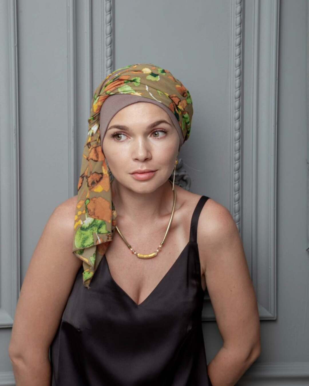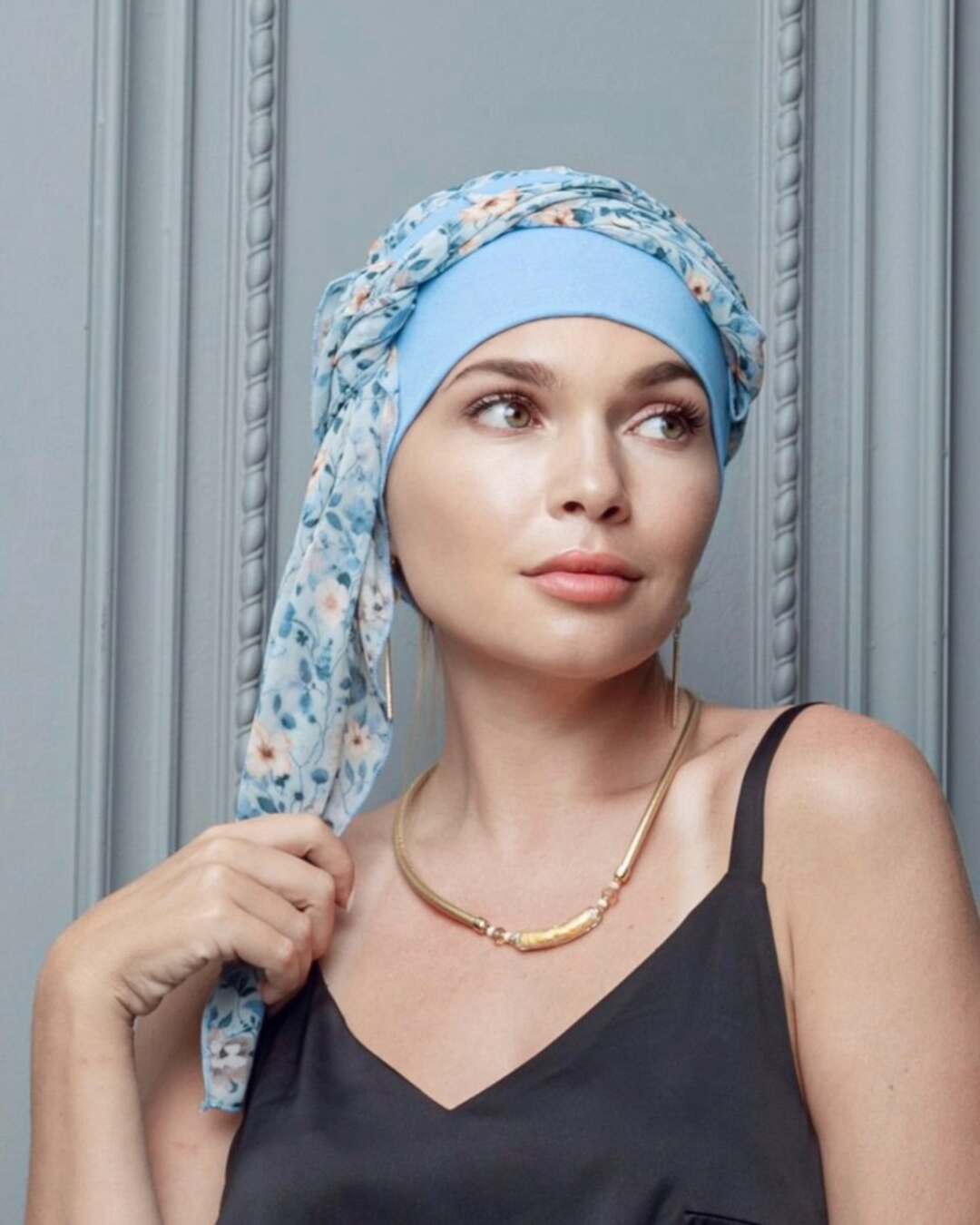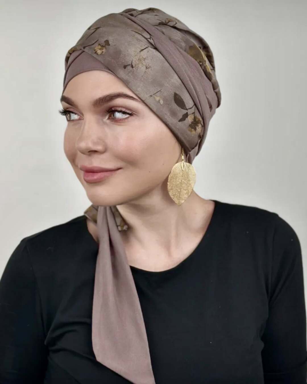 Тюрбан состоит из мягкой комфортной шапочки и двух лент, которые легко оборачиваются вокруг головы.